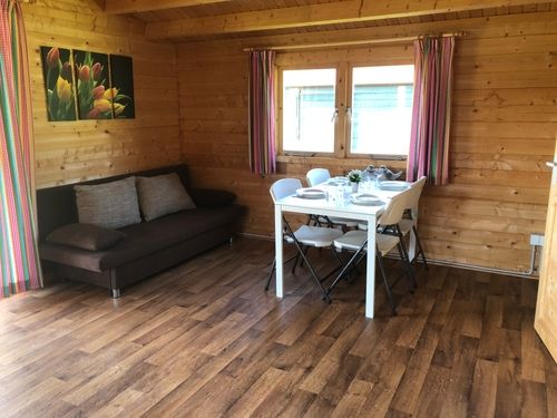 Binnen vind je een woonkamer met eethoek en slaapbank, en een open keuken met vierpits gastoestel, koelkast met vriesvak en koffiezetapparaat. Er zijn twee slaapkamers en extra slaapruimte in de woonkamer.