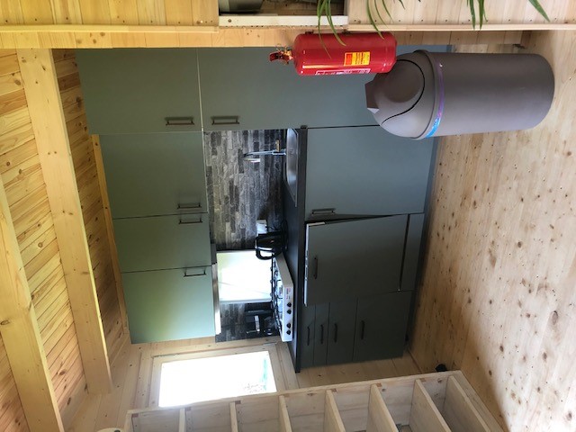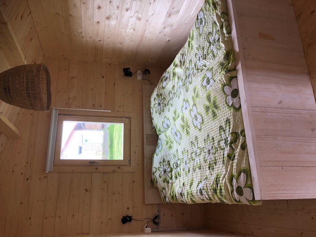 De blokhut beschikt over een privébadkamer met douche, toilet en wastafel, zodat je comfortabel en zelfstandig verblijft.