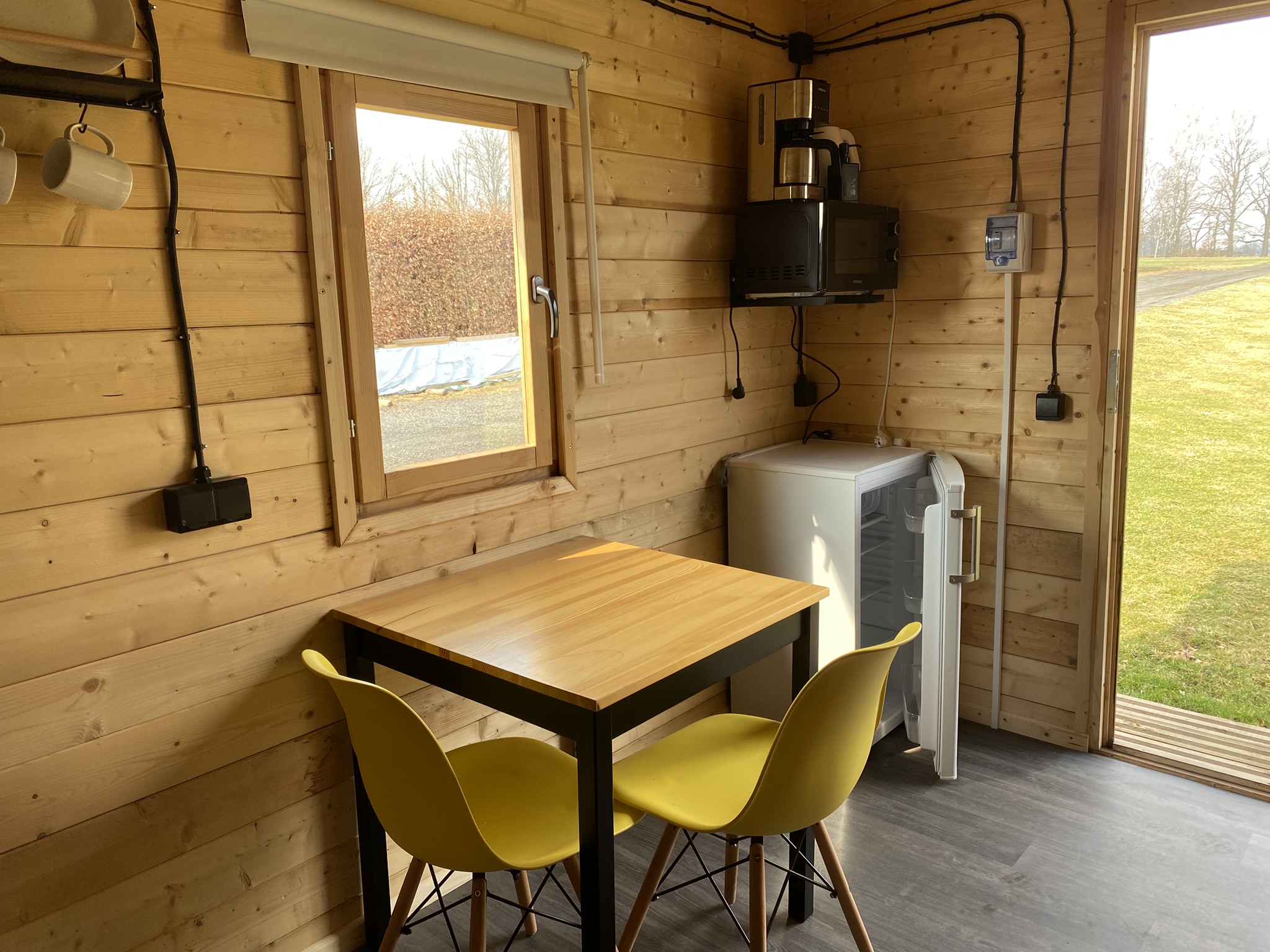 De hut is voorzien van elektriciteit en verlichting, zodat je ook ’s avonds comfortabel gebruikmaakt van de ruimte.